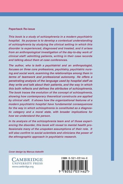This book is a study of schizophrenia in a modern psychiatric hospital. Its purpose is to develop a contextual understanding of schizophrenia by studying the clinical setting in which this disorder is experienced, diagnosed and treated, and it arises from an anthropological investigation of the day-to-day work of clinical staff. The author offers a penetrating analysis of the language used by hospital staff as they write and talk about their patients, and traces the evolution of the concept of schizophrenia, showing how contemporary theoretical constructs are applied by clinical staff. In its analysis of the schizophrenia team and of those experiencing the disorder, this book will reveal to mental health professionals many of the unspoken assumptions of their role. It will also confirm to social scientists and clinicians the power of the ethnographic approach in psychiatric research.