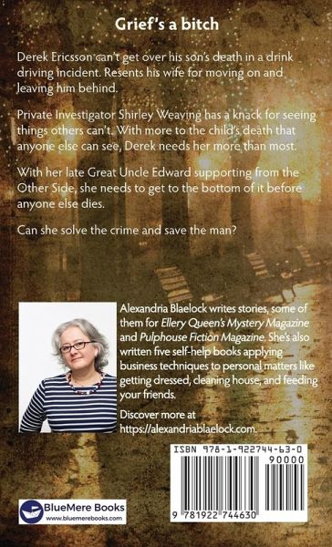 Grief's a bitch Derek Ericsson can't get over his son's death in a drink driving incident. Resents his wife for moving on and leaving him behind. Private Investigator Shirley Weaving has a knack for seeing things others can't. With more to the child's death that anyone else can see, Derek needs her more than most. With her late Great Uncle Edward supporting from the Other Side, she needs to get to the bottom of it before anyone else dies. Can she solve the crime and save the man? Can she resceu herself and the case?