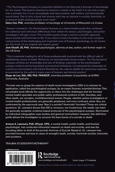 The best way to grasp the essence of death scene investigation (DSI) is to witness its application, called the psychological autopsy, by an expert forensic scientist/clinician. This remarkable book affords the opportunity to delve into the challenges that the forensic mental health specialist and public safety professional confront in DSI. Suicides, and often death, are complex, multidetermined events. People, whether police investigators or mental health professionals, are generally perplexed, and even confused, when they are confronted by the equivocal case. Was it a suicide? Homicide? Accident? These are critical questions. Dr. Leenaars shows that DSI is, however, not mysterious; the reader can learn the generally accepted, evidence-based protocols of the psychological autopsy. Illuminated by individual (idiographic) case studies and general (nomothetic) research, this definitive guide allows the investigator to uncover the bare bones of a suicide or death.
