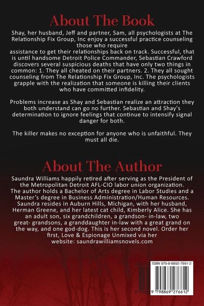 Shay, her husband, Jeff and partner, Sam, all psychologists at The Relationship Fix Group, Inc enjoy a successful practice counseling those who require assistance to get their relationships back on track. Successful, that is until handsome Detroit Police Commander, Sebastian Crawford discovers several suspicious deaths that have only two things in common: 1. They all cheated on their partners. 2. They all sought counseling from The Relationship Fix Group, Inc. The psychologists grapple with the realization that someone is killing their clients who have committed infidelity. Problems increase as Shay and Sebastian realize an attraction they both understand can go no further. Sebastian and Shay's determination to ignore feelings that continue to intensify signal danger for both. The killer makes no exception for anyone who is unfaithful. They must all die.