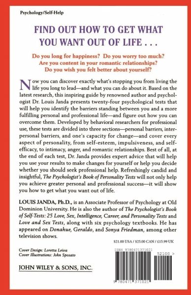 FIND OUT HOW TO GET WHAT YOU WANT OUT OF LIFE . . . Do you long for happiness? Do you worry too much? Are you content in your romantic relationships? Do you wish you felt better about yourself? Now you can discover exactly what's stopping you from living the life you long to lead-and what you can do about it. Based on the latest research, this inspiring guide by renowned author and psychologist Dr. Louis Janda presents twenty-four psychological tests that will help you identify the barriers standing between you and a more fulfilling personal and professional life-and figure out how you can overcome them. Developed by behavioral researchers for professional use, these tests are divided into three sections-personal barriers, interpersonal barriers, and one's capacity for change-and cover every aspect of personality, from self-esteem, impulsiveness, and self-efficacy, to intimacy, anger, and romantic relationships. Best of all, at the end of each test, Dr. Janda provides expert advice that will help you use your results to make changes for yourself or help you decide whether you should seek professional help. Refreshingly candid and insightful, The Psychologist's Book of Personality Tests will not only help you achieve greater personal and professional success-it will show you how to get what you want out of life.