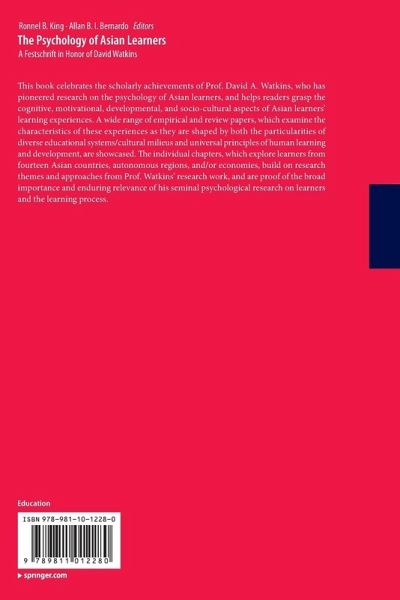 Introduction.- 1 Advancing psychological studies on Asian learners: Continuing the legacy of David A. Watkins.- 2 A journey through David Watkins's research and contribution to cross-cultural psychology.- Part 1: Beliefs about learning and schooling.- 3 The indispensable role of culture in shaping children's learning beliefs.- 4 Understanding of students' beliefs about knowledge and learning in social and cultural context - A case of Korean Middle School Students.- 5 Youths' reasoning about higher education in Macao.- 6 Filipino students' reasons for not being motivated in school: Insights into their implicit beliefs about motivation and learning.- Part 2: Self-Related Processes.- 7 Testing the internal and external frames of reference for academic self-concept among Chinese vocational students.- 8 The Arab culture and the Arab self: Emphasis on Gender.- 9 Theoretical and Psychometric review of Arabic teachers' self-efficacy beliefs research.- 10 The role of self-efficacy and connectedness in the academic success of Chinese learners.- Part 3: Approaches to learning.- 11 Understanding and teaching the Chinese learner: Resolving the paradox of the Chinese learner.- 12 The predictive power of psychological types for learning approaches among Chinese university students.- 13 Pre-service teachers' approaches to learning and their learning outcomes: A Malaysian experience.- 14 The effects of culture and sex on students' approaches to learning: Inspiring insights from David Watkins's intellectual inquiries.- Part 4: Learning Motivation.- 15 The role of autonomous motivation for academic engagement of Indonesian secondary school students: A multilevel modelling approach.- 16 The Motivation-Achievement paradox in international educational achievement tests: Towards a better understanding.- 17 Curiosity and student learning in General Education.- 18 Exploring links between time perspective and academic motivation among Filipino undergraduates.- 19 Japanese students'motivation towards English as a foreign language.- Part 5: Learning Goals.- 20 Reciprocal relations between Chinese students' beliefs of competence, effort goal, and academic achievement.- 21 Goals matter and effort counts: The effects of achievement goals and effort on moral image, approval, and disapproval in a Chinese cultural context.- 22 Motivation of Chinese learners: An integration of Etic and Emic approaches.- 23 The conjoint influence of achievement goals in Filipino students' sense of Self, facilitating conditions and school outcomes: A personal investment theory analysis.- 24 Relation of social motivation and gender on academic achievement in Qatar.- 25 Examining the link between social goals and learning strategies.- Part 6: Adjustment and Well-being.- 26 Mainland Chinese students' responses to the cognitive conflicts in their adaptation to a Hong Kong university: A developmental perspective.- 27 Travelling a thousand miles: Determinants of cross-cultural adaption of Asian students in Australia.- 28 Basic psychological needs and flourishing in Filipino university students.- 29 Stress, positive psychological resources, and mental health of migrant Chinese postgraduate students in Macau.- 30 Positive emotions predict students' well-being and academic motivation: The Broaden-and-Build approach.- 31 The successful life of gritty students: Grit leads to optimal.- Part 7: Learning Environments.- 32 Academically At-risk adolescents in Singapore: The importance of teacher support in promoting academic engagement.- 33 From classroom environment to conception of Mathematics.- 34 Promoting students' creative self-efficacy: An field experimental study in Singapore secondary classrooms.- Part 8: Socio-cultural influences.- 35 Materialism and achievement motivation: How Chinese primary school children, secondary school teenagers, and university students are similar.- 36 Self-construal, incremental beliefs of ability, and learning preferences of Singapore students.- 37Social axioms and academic achievement among Filipino college students.- 38 Understanding Chinese students' achievement patterns: Perspectives from social-oriented achievement motivation.- 39 Early learning experiences of young Chinese learners in Hong Kong: The role of traditional values and changing educational policy.- Epilogue.- 40 Asian learners: Retrospect and Prospect.