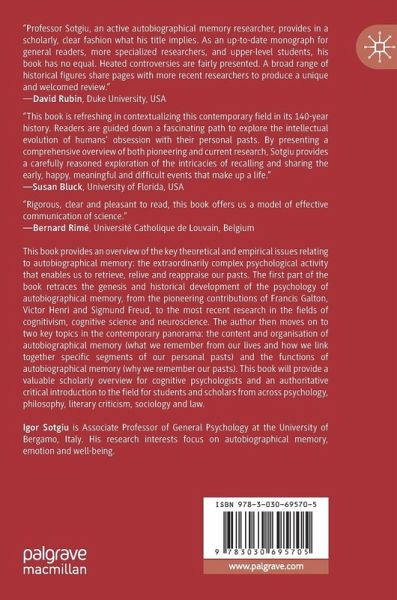 This book provides an overview of the key theoretical and empirical issues relating to autobiographical memory: the extraordinarily complex psychological activity that enables us to retrieve, relive and reappraise our pasts. The first part of the book retraces the genesis and historical development of the psychology of autobiographical memory, from the pioneering contributions of Francis Galton, Victor Henri and Sigmund Freud, to the most recent research in the fields of cognitivism, cognitive science and neuroscience. The author then moves on to two key topics in the contemporary panorama: the content and organisation of autobiographical memory (what we remember from our lives and how we link together specific segments of our personal pasts) and the functions of autobiographical memory (why we remember our pasts). This book will provide a valuable scholarly overview for cognitive psychologists and an authoritative critical introduction to the field for students and scholars fromacross psychology, philosophy, literary criticism, sociology and law.