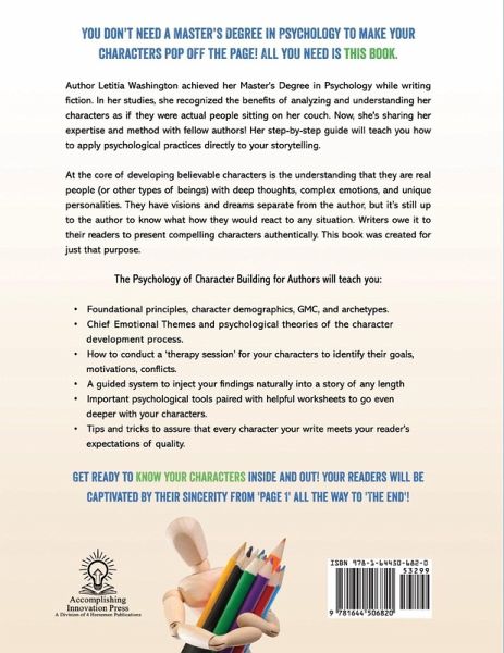 You don't need a Master's Degree in Psychology to make your characters pop off the page! All you need is this book. Author Letitia Washington achieved her Master's Degree in Psychology while writing fiction. In her studies, she recognized the benefits of analyzing and understanding her characters as if they were actual people sitting on her couch. Now, she's sharing her expertise and method with fellow authors! Her step-by-step guide will teach you how to apply psychological practices directly to your storytelling. At the core of developing believable characters is the understanding that they are real people (or other types of beings) with deep thoughts, complex emotions, and unique personalities. They have visions and dreams separate from the author, but it's still up to the author to know what how they would react to any situation. Writers owe it to their readers to present compelling characters authentically. This book was created for just that purpose. The Psychology of Character Building for Authors will teach you: ¿ Foundational principles, character demographics, GMC, and archetypes ¿ Chief Emotional Themes and psychological theories of the character development process ¿ How to conduct a 'therapy session' for your characters to identify their goals, motivations, conflicts ¿ A guided system to inject your findings naturally into a story of any length ¿ Important psychological tools paired with helpful worksheets to go even deeper with your characters ¿ Tips and tricks to assure that every character your write meets your reader's expectations of quality Get ready to know your characters inside and out! Your readers will be captivated by their sincerity from 'Page 1' all the way to 'The End'!