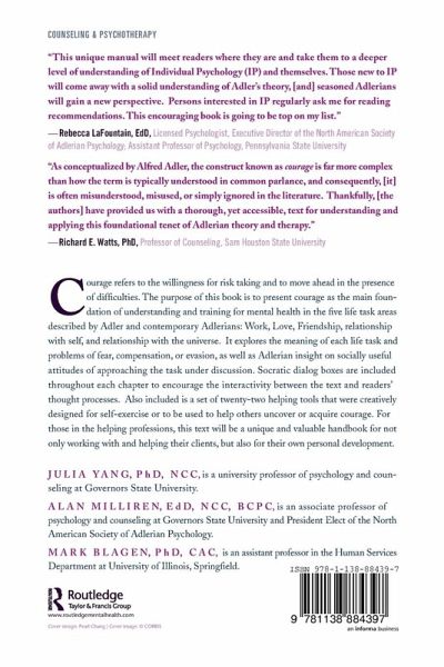 Courage refers to the willingness for risk taking and to move ahead in the presence of difficulties. The purpose of this book is to present courage as the main foundation of understanding and training for mental health in the three life task areas described by Adler: Work, Love, and Friendship. It explores the meaning of each life task and problems of fear, compensation, or evasion, as well as Adlerian insight on socially useful attitudes of approaching the task under discussion. Socratic dialog boxes are included throughout each chapter to encourage the interactivity between the text and readers' thought processes. Also included is a set of twenty-two helping tools that were creatively designed for self-exercise or to be used to help others uncover or acquire courage. For those in the helping professions, this text will be a unique and valuable handbook for not only working with and helping their clients, but also for their own personal development.