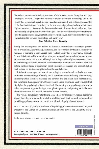 Winner, 2021 Lawrence S. Wrightsman Book Award, given by the American Psychology-Law Society Bridges family law and current psychological research to shape understanding of legal doctrine and policy Family law encompasses legislation related to domestic relationships-marriages, parenthood, civil unions, guardianship, and more. No other area of law touches so closely to home, or is changing at such a rapid pace-in fact, family law is so dynamic precisely because it is inextricably intertwined with psychological issues such as human behavior, attitudes, and social norms. However, although psychology and family law may seem a natural partnership, both fields have much to learn from each other. Our laws often fail to take into account our empirical knowledge of psychology, falling back instead on faulty assumptions about human behavior. This book encourages our use of psychological research and methods to inform understandings of family law. It considers issues including child custody, intimate partner violence, marriage and divorce, and child and elder maltreatment. For each topic discussed, Eve Brank presents a case, statute, or legal principle that highlights the psychological issues involved, illuminating how psychological research either supports or opposes the legal principles in question, and placing particular emphasis on the areas that are still in need of further research. The volume identifies areas where psychology practice and research already have been or could be useful in molding legal doctrine and policy, and by providing psychology researchers with new ideas for legally relevant research.