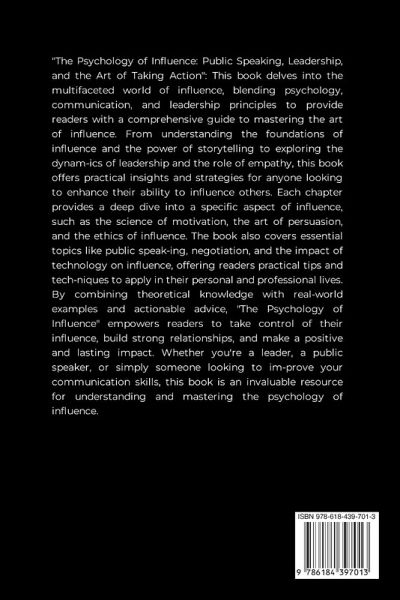 "The Psychology of Influence: Public Speaking, Leadership, and the Art of Taking Action": This book delves into the multifaceted world of influence, blending psychology, communication, and leadership principles to provide readers with a comprehensive guide to mastering the art of influence. From understanding the foundations of influence and the power of storytelling to exploring the dynamics of leadership and the role of empathy, this book offers practical insights and strategies for anyone looking to enhance their ability to influence others. Each chapter provides a deep dive into a specific aspect of influence, such as the science of motivation, the art of persuasion, and the ethics of influence. The book also covers essential topics like public speaking, negotiation, and the impact of technology on influence, offering readers practical tips and techniques to apply in their personal and professional lives. By combining theoretical knowledge with real-world examples and actionable advice, "The Psychology of Influence" empowers readers to take control of their influence, build strong relationships, and make a positive and lasting impact. Whether you're a leader, a public speaker, or simply someone looking to improve your communication skills, this book is an invaluable resource for understanding and mastering the psychology of influence.