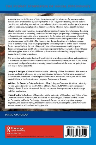 Chapters in the book investigate the psychological origins of insecurity, evolutionary theorizing about the functions of insecurity, the motivational strategies people adopt to manage insecurity, self-regulation strategies, the role of insecurity in the formation and maintenance of social relationships, and the influence of insecurity and uncertainty on the organization of larger social systems and public affairs. The chapters also discuss how insecurity influences many areas of contemporary social life, highlighting the applied implications of this line of research. Topics covered include the role ofinsecurity in social communication, social judgments, decision-making, group identification, morality, interpersonal behaviour, relationships, attitudes, and many applied aspects of social life and politics where understanding the psychology of insecurity is of critical importance.