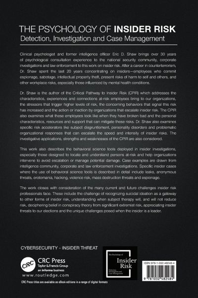 Dr. Shaw is the author of the Critical Pathway to Insider Risk (CPIR) which addresses the characteristics, experiences and connections at-risk employees bring to our organizations, the stressors that trigger higher levels of risk, the concerning behaviors that signal this risk has increased and the action or inaction by organizations that escalate insider risk. The CPIR also examines what these employees look like when they have broken bad and thepersonal characteristics, resources and support that can mitigate these risks. Dr. Shaw also examines specific risk accelerators like subject disgruntlement, personality disorders and problematic organizational responses that can escalate the speed and intensity of insider risks. The investigative applications, strengths and weaknesses of the CPIR are also considered.