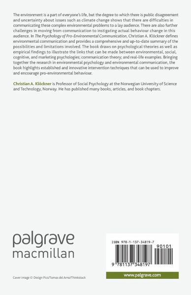 The environment is part of everyone's life, but the degree to which there is public disagreement and uncertainty about issues like climate change shows that there are difficulties in communicating these complex environmental problems to a lay audience. There are also further challenges in moving from communication to instigating actual behaviour change in this audience. In The Psychology of Pro-Environmental Communication, Christian Klöckner defines environmental communication and provides a comprehensive and up-to-date summary of the possibilities and limitations involved. This book draws on psychological theories as well as empirical findings to illustrate the links that can be made between environmental, social, cognitive, and marketing psychologies; communication theory and real life examples. Bringing together the research in environmental psychology and environmental communication, this book highlights established and innovative intervention techniques that can be used to improve and encourage pro-environmental behaviour.