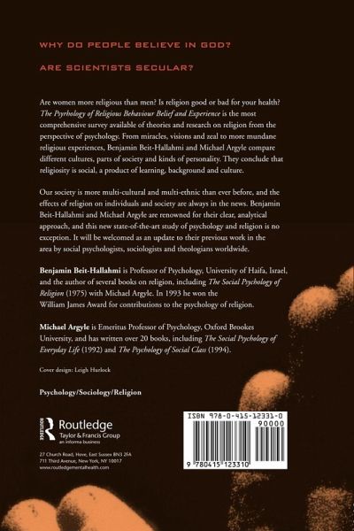 Because society is increasingly secular, it may seem irrelevant to consider the psychology of religion. But the diversity of our multi-ethnic and multi-cultural society in fact makes religion more important to the social sciences than it has ever been before. What are the social consequences of religion? Every day the news is full of events that can be blamed on religion perpetrated by a range of groups from whole societies to individuals. Beit-Hallami and Argyle are renowned for their clear, analytical approach to topics and this new, state-of-the-art study of psychology and religion is no exception. It will be welcomed as an update to their previous work in the area by social psychologists, sociologists and theologians worldwide.