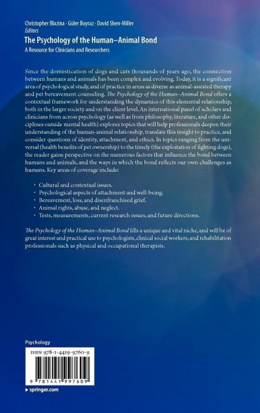 There have been dramatic increases in the financial, emotional, and psychological investment in pets over the past four decades. The increasing importance of animal companions in people's lives has resulted in growing emphasis on the human-animal bond within academic literature. This book introduces practicing and emerging professionals to vital subject matter concerning this growing specialty area by providing an essential framework and information through which to consider the unique contextual backdrop of the human-animal bond. Such contexts include a wide array of themes including: issues of attachment and loss, success and frustration with making and sustaining connections, world views regarding animal ethics, familial history of neglect or abuse, and cultural dynamics that speak to the order of things between mankind and nature. Adopting a contextual stance will aid mental health professionals in appreciating why and how this connection has become a significant part of everyday life for many. As with any other important clinical dynamic, training and preparation are needed to gain competence for professional practice and research. To this end, an ensemble of international experts across the fields of psychology and mental health explore topics that will help both new and established clinicians increase and understanding of the various ways the human-animal bond manifests itself. Perspectives from beyond the scope of psychology and mental health such as anthropology, philosophy, literature, religion, and history are included to provide a sampling of the significant contexts in which the human-animal bond is established. What brings these divergent topics together in a meaningful way is their relevance and centrality to the contextual bonds that underlie the human-animal connection. This text will be a valuable resource that provides opportunities to deepen one's expertise in understanding the psychology of the human-animal bond.