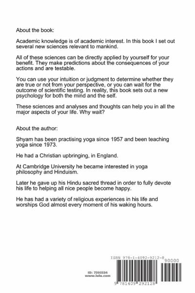 Academic knowledge is of academic interest. In this book I set out several new sciences relevant to mankind. All of these sciences can be directly applied by yourself for your benefit. They make predictions about the consequences of your actions and are testable. You can use your intuition or judgment to determine whether they are true or not from your perspective, or you can wait for the outcome of scientific testing. In reality, this book sets out a new psychology for both the mind and the self. These sciences and analyses and thoughts can help you in all the major aspects of your life. Why wait?