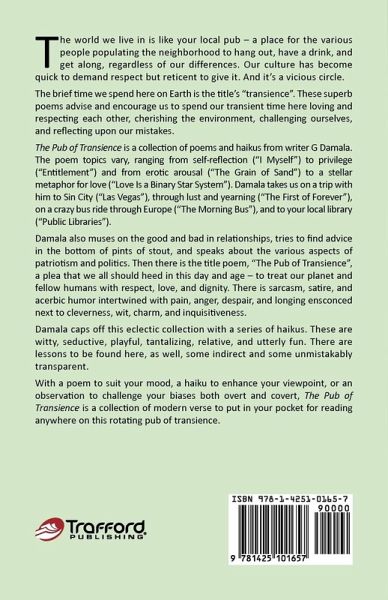 The world we live in is like your local pub - a place for the varied people who populate the surrounding area to hang out, have a drink, and get along, regardless of race, creed, color, religion, whatever the difference. Our culture has become quick to demand respect but reticent to give it. It's a vicious circle. And the brief time that we all spend here is the transience because our time here is fleeting, at least in the totality of it all. We should spend our brief time here loving others, respecting each other, cherishing the beauty all around us, challenging ourselves, and reflecting upon our mistakes, our past, and our actions. The Pub of Transience is a collection of poems from writer G Damala. The poem topics are varied, ranging from self-reflection ("I Myself") to privilege ("Entitlement") to erotic arousal ("The Grain of Sand") to a stellar metaphor for love ("Love Is a Binary Star System"). Damala takes on a trip with him to Sin City ("Las Vegas"), through lust and yearning ("The First of Forever"), on a crazy bus ride through Europe ("The Morning Bus"), and to your local library ("Public Libraries"). Damala also muses on the good and bad in relationships, he tries to seek advice in the bottom of pints of stout, and speaks about the various aspects of patriotism and politics. Then there is the title poem, "The Pub of Transience", a plea that we all should heed in this day and age - to treat our planet and fellow humans with respect, love, and dignity. There is sarcasm, satire, and acerbic humor intertwined with pain, anger, despair, and longing ensconced next to cleverness, wit, charm, and inquisitiveness. Damala caps off this eclectic piece of work with a collection of haikus. These are witty, seductive, playful, tantalizing, relative, and utterly fun. There are lessons to be found here, as well, some of it indirect and some of it unmistakably transparent. With a poem to suit your mood, a haiku to enhance your viewpoint, or an observation to challenge your biases both overt and covert, The Pub of Transience is a collection of modern verse to put in your pocket for reading anywhere on this rotating pub of transience.
