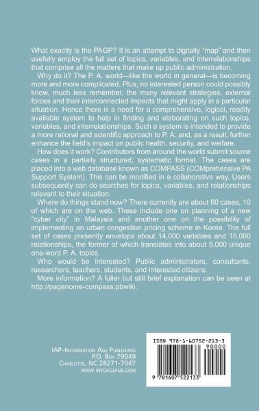What is it? The Public Administration Genome Project (PAGP) is a grand attempt to digitally "map" and then usefully employ the full set of topics, variables, and interrelationships that comprise and involve all of the "genes" that make up public administration. It is based on the highly regarded and useful Human Genome Project. Why do it? Like the world in general, the P. A. world is becoming more diverse and complicated. Hence, few administrators can be expected to know, much less remember, the many relevant strategies, external forces and related impacts that might be part of a particular situation. There thus is a need for a comprehensive, logic-based, readily accessible system (called "COMPASS") to help in finding and elaborating on such topics, variables, and interrelationships. What is in the book? It starts with a broad overview of the whole PAGP. It then turns to an elaboration of both the basic and then the more comprehensive analogies with the human genome; the Human Genome Project; and other related concepts (like catalysis and evolution). These are followed by a set of new and seemingly unconnected subjects: (a) norms for citizens and public administrators, and (b) semantic and syntactic analyses. Then come some interesting and diverse case studies, and comparisons of such to theories. All these set the scene for development of procedures for contributing to and using COMPASS, the information and guidance system which is the central product of the PAGP. The whole concept of the PAGP subsequently is revisited through an example that encompasses all of its major elements and processes. The last part of the book focuses on future directions, asking questions like "Is the PAGP (and COMPASS) an impossible dream or a much needed reality?"