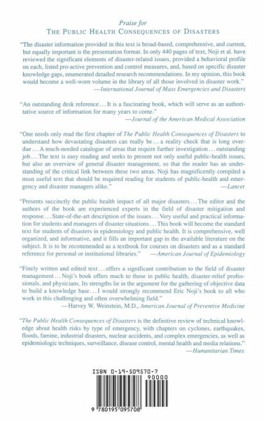 Illustrated with examples from recent research in the field, this book summarizes the most pertinent and useful information about the public health impact of natural and man-made disasters. It is divided into four sections dealing with general concerns, geophysical events, weather-related problems, and human-generated disasters. The author starts with a comprehensive discussion of the concepts and role of surveillance and epidemiology, highlighting general environmental health health concerns, such as sanitation, water, shelter, and sewage. The other chapters, based on a variety of experiences and literature drawn from both developing and industrialized countries, cover discrete types of natural and technological hazards, addressing their history, origin, nature, observation, and control. Throughout the book the focus is on the level of epidemiologic knowledge on each aspect of natural and man-made disasters. Exposure-, disease-, and health-event surveillance are stressed because of the importance of objective data to disaster epidemiology. In addition, Noji pays particular attention to prevention and control measures, and provides practical recommendations in areas in which the public health practitioner needs more useful information. He advocates stronger epidemiologic awareness as the basis for better understanding and control of disasters. A comprehensive theoretical and practical treatment of the subject, The Public Health Consequences of Disasters is an invaluable tool for epidemiologists, disaster relief specialists, and physicians who treat disaster victims.