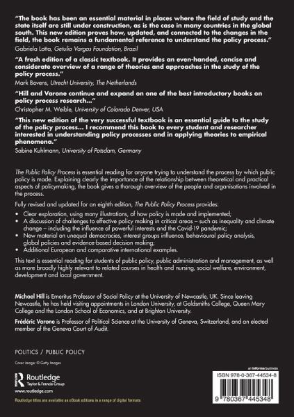 "In the 8th Edition of The Public Policy Process, Hill and Varone continue and expand on one of the best introductory books on policy process research. This book excels in making the complexities inherent in policy processes more understandable without reverting to overly simplified and distorted depictions. This latest edition brings in needed work on inequality, power, and democracy, which connects it to the most pressing challenges in society. Based on crisp conceptualizations and comprehensive theoretical foundations, this book offers a firm foundation for new students and experienced scholars for understanding, studying, and influencing policy processes."