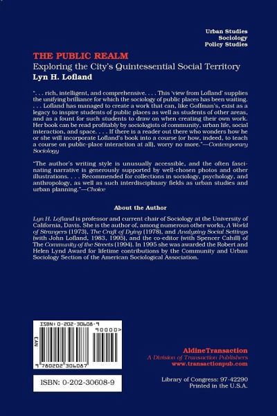 This book is about the "public realm," defined as a particular kind of social territory that is found almost exclusively in large settlements. This particular form of social-psychological space comes into being whenever a piece of actual physical space is dominated by relationships between and among persons who are strangers to one another, as often occurs in urban bars, buses, plazas, parks, coffee houses, streets, and so forth. More specifically, the book is about the social life that occurs in such social-psychological spaces (the normative patterns and principles that shape it, the relationships that characterize it, the aesthetic and interactional pleasures that enliven it) and the forces (anti-urbanism, privatism, post-war planning and architecture) that threaten it. The data upon which the book's analysis is based are diverse: direct observation; interviews; contemporary photographs, historic etchings, prints and photographs, and historical maps; histories of specific urban public spaces or spatial types; and the relevant scholarly literature from sociology, environmental psychology, geography, history, anthropology, and architecture and urban planning and design. Its central argument is that while the existing body of accomplished work in the social sciences can be reinterpreted to make it relevant to an understanding of the public realm, this quintessential feature of city life deserves much more u it deserves to be the object of direct scholarly interest in its own right. Choice noted that: "The author's writing style is unusually accessible, and the often fascinating narrative is generously supported by well-chosen photos."