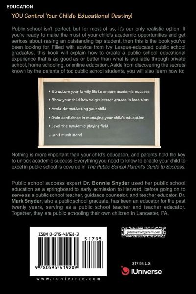 YOU control your child's destiny! Public school isn't perfect, but for most of us, it's our only realistic option. If you're ready to make the most of your child's academic opportunities and get serious about raising an outstanding top student, then this is the book you've been looking for. Filled with advice from Ivy League-educated public school graduates, this book will explain how to create a public school educational experience that is as good as or better than what is available through private school, home schooling, or online education. Aside from discovering the secrets known by the parents of top public school students, you will also learn how to: * Structure your family life to ensure academic success * Show your child how to get better grades in less time * Avoid de-motivating your child * Gain confidence in managing your child's education .and much more! Nothing is more important than your child's education, and parents hold the key to unlock academic success. Everything you need to know to enable your child to excel in public school is covered in The Public School Parent's Guide to Success.