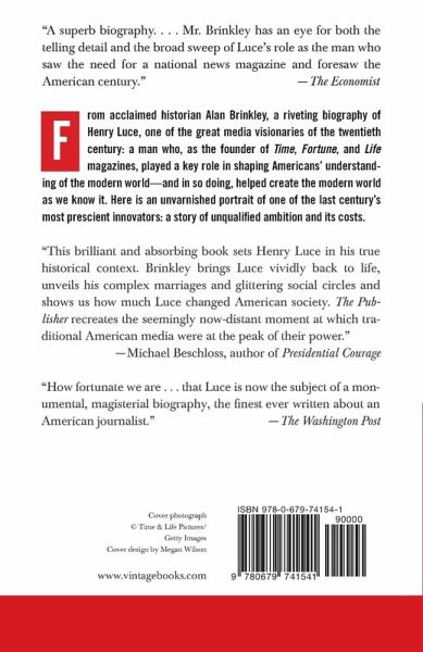 Acclaimed historian Alan Brinkley gives us a sharply realized portrait of Henry Luce, arguably the most important publisher of the twentieth century. As the founder of Time, Fortune, and Life magazines, Luce changed the way we consume news and the way we understand our world. Born the son of missionaries, Henry Luce spent his childhood in rural China, yet he glimpsed a milieu of power altogether different at Hotchkiss and later at Yale. While working at a Baltimore newspaper, he and Brit Hadden conceived the idea of Time: a "news-magazine" that would condense the week's events in a format accessible to increasingly busy members of the middle class. They launched it in 1923, and young Luce quickly became a publishing titan. In 1936, after Time's unexpected success-and Hadden's early death-Luce published the first issue of Life, to which millions soon subscribed. Brinkley shows how Luce reinvented the magazine industry in just a decade. The appeal of Life seemingly cut across the lines of race, class, and gender. Luce himself wielded influence hitherto unknown among journalists. By the early 1940s, he had come to see his magazines as vehicles to advocate for America's involvement in the escalating international crisis, in the process popularizing the phrase "World War II." In spite of Luce's great success, happiness eluded him. His second marriage-to the glamorous playwright, politician, and diplomat Clare Boothe-was a shambles. Luce spent his later years in isolation, consumed at times with conspiracy theories and peculiar vendettas. The Publisher tells a great American story of spectacular achievement-yet it never loses sight of the public and private costs at which that achievement came.