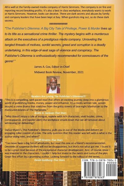 Midwest Book Review, Critique: The Publisher's Dilemma: A Big City Tale of Privilege, Power & Murder lives up to its title as a sensational crime thriller. The mystery begins with a murderous attack on the executives of a prestigious media company, immediately after the company had taken steps toward more racial diversity. Unraveling the tangled threads of motives, sordid secrets, greed and corruption is a deadly undertaking, in this edge-of-seat saga of violence and conspiracy. The Publisher's Dilemma is enthusiastically recommended for connoisseurs of the genre! A shooting at the media company of Harris Simmons has left its legendary CEO dead and the company President, the African American wunderkind, Donald Alexander in a coma. Harris Simmons, led by the CEO and President team of Gill Harris and his heir apparent Don Alexander, is a world-class company in the midst of an unparalleled period of performance. But behind the scenes, there are long-simmering tensions that have heated up to a roiling boil. As he begins a transformative change in the company, Alexander hires star executive Kwame Mills. When gunshots ring out, it is Mills who is summoned to the scene of the crime and becomes a central figure in the murder mystery that a contingent of hungry gossip reporters turn into the talk of the city. The police investigation that follows reveals Harris Simmons as a place with dark secrets, predatory actors and master abusers of power and privilege. And when the case is solved, it won't be quiet. It will be dramatic and change the company of Harris Simmons forever