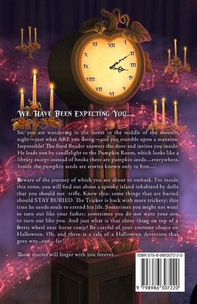You're wandering around in the forest in the middle of the moonlit night--just what ARE you doing--and you stumble upon a mansion. Impossible! The Seed Reader answers the door and invites you inside. He leads you by candlelight to the Pumpkin Room, which looks like a library except instead of books there are pumpkin seeds. . . everywhere. Inside the pumpkin seeds are stories known only to him. . . . Beware of the journey of which you are about to embark. For inside this tome, you will find out about a spooky island inhabited by dolls that you should not trifle. Know this: some things that are buried should STAY BURIED. The Tricker is back with more trickery; this time he needs souls to extend his life. Sometimes you might not want to turn out like your father; sometimes you do not want your son to turn out like you. And just what is that shiny thing on top of a Ferris wheel near horse camp? Be careful of your costume choice on Halloween. Oh, and there is a tale of a Halloween detention that goes. . . way. . . too. . . far! These stories will linger with you forever!