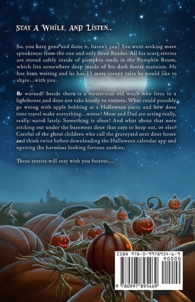 Stay A While And Listen... So, you have gone and done it, haven't you? You went seeking more spookiness from the one and only Seed Reader. All his scary stories are stored safely inside of pumpkin seeds in the Pumpkin Room, which lies somewhere deep inside of his dark forest mansion. He has been waiting and he has 13 more creepy tales he would like to share...with you. Be warned! Inside there is a mysterious old witch who lives in a lighthouse and does not take kindly to visitors. What could possibly go wrong with apple bobbing at a Halloween party and how does time travel make everything...worse? Mom and Dad are acting really, really, weird lately. Something is afoot! And what about that note sticking out under the basement door that says to keep out, or else? Careful of the ghost children who call the graveyard next door home and think twice before downloading the Halloween calendar app and opening the harmless looking fortune cookies. These stories will stay with you forever....