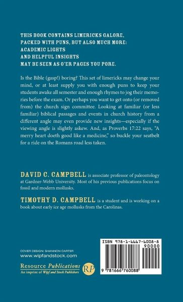 This book contains limericks galore, Packed with puns, but also much more: Academic lights And helpful insights May be seen as o'er pages you pore. Is the Bible (gasp!) boring? This set of limericks may change your mind, or at least supply you with enough puns to keep your students awake all semester and enough rhymes to jog their memories before the exam. Or perhaps you want to get onto (or removed from) the church sign committee. Looking at familiar (or less familiar) biblical passages and events in church history from a different angle may even provide new insights--especially if the viewing angle is slightly askew. And, as Proverbs 17:22 says, "A merry heart doeth good like a medicine," so buckle your seatbelt for a ride on the Romans road less taken.