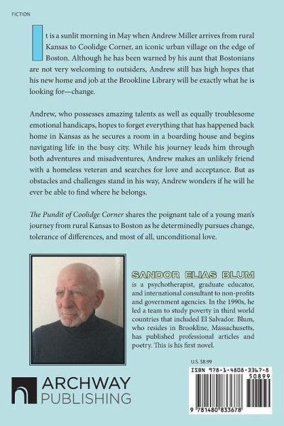 It is a sunlit morning in May when Andrew Miller arrives from rural Kansas to Coolidge Corner, an iconic urban village on the edge of Boston. Although he has been warned by his aunt that Bostonians are not very welcoming to outsiders, Andrew still has high hopes that his new home and job at the Brookline Library will be exactly what he is looking for--change. Andrew, who possesses amazing talents as well as equally troublesome emotional handicaps, hopes to forget everything that has happened back home in Kansas as he secures a room in a boarding house and begins navigating life in the busy city. While his journey leads him through both adventures and misadventures, Andrew makes an unlikely friend with a homeless veteran and searches for love and acceptance. But as obstacles and challenges stand in his way, Andrew wonders if he will he ever be able to find where he belongs. The Pundit of Coolidge Corner shares the poignant tale of a young man's journey from rural Kansas to Boston as he determinedly pursues change, tolerance of differences, and most of all, unconditional love.