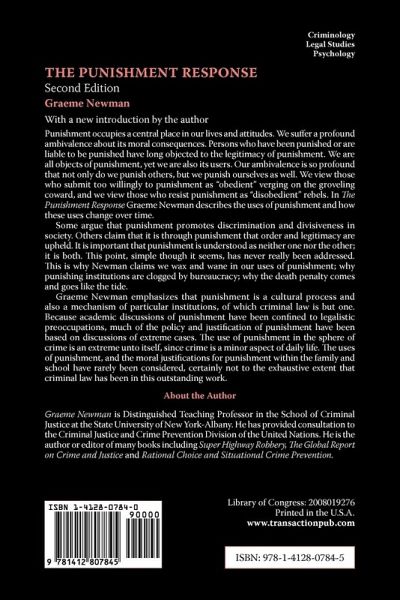 Punishment occupies a central place in our lives and attitudes. We suffer a profound ambivalence about its moral consequences. Persons who have been punished or are liable to be punished have long objected to the legitimacy of punishment. We are all objects of punishment, yet we are also its users. Our ambivalence is so profound that not only do we punish others, but we punish ourselves as well. We view those who submit too willingly to punishment as "obedient" verging on the groveling coward, and we view those who resist punishment as "disobedient," rebels. In The Punishment Response Graeme Newman describes the uses of punishment and how these uses change over time.Some argue that punishment promotes discrimination and divisiveness in society. Others claim that it is through punishment that order and legitimacy are upheld. It is important that punishment is understood as neither one nor the other; it is both. This point, simple though it seems, has never really been addressed. This is why Newman claims we wax and wane in our uses of punishment; why punishing institutions are clogged by bureaucracy; why the death penalty comes and goes like the tide.Graeme Newman emphasizes that punishment is a cultural process and also a mechanism of particular institutions, of which criminal law is but one. Because academic discussions of punishment have been confined to legalistic preoccupations, much of the policy and justification of punishment have been based on discussions of extreme cases. The use of punishment in the sphere of crime is an extreme unto itself, since crime is a minor aspect of daily life. The uses of punishment, and the moral justifications for punishment within the family and school have rarely been considered, certainly not to the exhaustive extent that criminal law has been in this outstanding work.