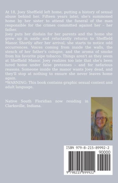 At 18, Joey Sheffield left home, putting a history of sexual abuse behind her. Fifteen years later, she's summoned home by her sister, Rosemary, to attend the funeral of the man responsible for the crimes committed against her - her father, MacArthur Sheffield. Not wanting to let her sisters down by not showing up, Joey puts her disdain for her parents and the home she grew up in aside and reluctantly returns to Sheffield Manor. Shortly after her arrival, she starts to notice odd occurrences. Voices coming from inside the walls, the stench of her father's cologne, and the aroma of smoke from his favorite pipe tobacco. Things aren't as they seem at Sheffield Manor. When Joey learns that no funeral arrangements have been made for her father, and that no citizens in the town of Cornish, Alabama are aware of his death, she realizes that she's been lured home under false pretenses - and for nefarious reasons. Someone inside the manor wants Joey dead, and they'll stop at nothing to ensure she doesn't leave there alive. *WARNING: This book contains graphic sexual content and adult language.