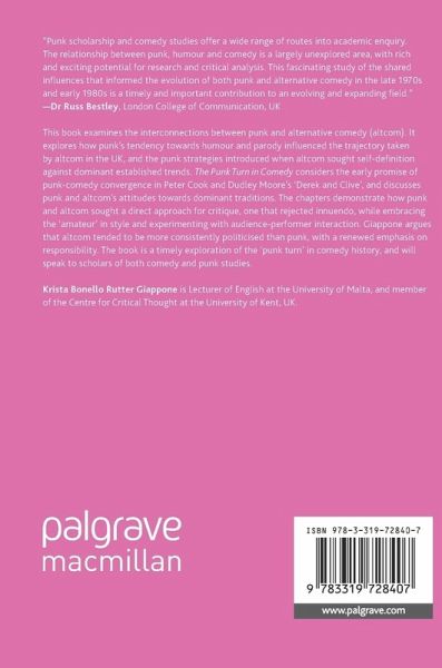 This book examines the interconnections between punk and alternative comedy (altcom). It explores how punk's tendency towards humour and parody influenced the trajectory taken by altcom in the UK, and the punk strategies introduced when altcom sought self-definition against dominant established trends. The Punk Turn in Comedy considers the early promise of punk-comedy convergence in Peter Cook and Dudley Moore's 'Derek and Clive', and discusses punk and altcom's attitudes towards dominant traditions. The chapters demonstrate how punk and altcom sought a direct approach for critique, one that rejected innuendo, while embracing the 'amateur' in style and experimenting with audience-performer interaction. Giappone argues that altcom tended to be more consistently politicised than punk, with a renewed emphasis on responsibility. The book is a timely exploration of the 'punk turn' in comedy history, and will speak to scholars of both comedy and punk studies.