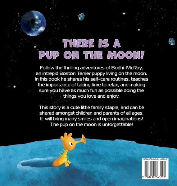 THERE IS A PUP ON THE MOON! Follow the thrilling adventures of Bodhi-McRay, an intrepid Boston Terrier puppy living on the moon. In this book he shares his self-care routines, teaches the importance of taking time to relax, and making sure you have as much fun as possible doing the things you love and enjoy. This story is a cute little family staple, and can be shared amongst children and parents of all ages. It will bring many smiles and open imaginations! The pup on the moon is unforgettable!