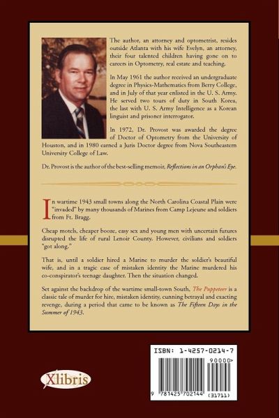 In wartime 1943 small towns along the North Carolina Coastal Plain were 'invaded" by many thousands of Marines from Camp Lejeune and soldiers from Ft. Bragg. Cheap motels, cheaper booze, easy sex and young men with uncertain futures disrupted the life of rural Lenoir County. However, civilians and soldiers 'got along." That is, until a soldier hired a Marine to murder the soldier's beautiful wife, and in a tragic case of mistaken identity the Marine murdered his co-conspirator's teenage daughter. Then the situation changed. Set against the backdrop of the wartime small-town South, The Puppeteer is a classic tale of murder for hire, mistaken identity, cunning betrayal and exacting revenge, during a period that came to be known as The Fifteen Days in the Summer of 1943.