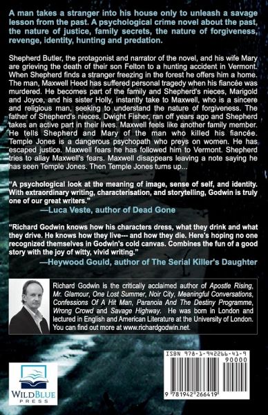 A man takes a stranger into his house only to unleash a savage lesson from the past. A psychological crime novel about the past, the nature of justice, family secrets, the nature of forgiveness, revenge, identity, hunting and predation. Shepherd Butler, the protagonist and narrator of the novel, and his wife Mary are grieving the death of their son Felton to a hunting accident in Vermont. When Shepherd finds a stranger freezing in the forest he offers him a home. The man, Maxwell Heed has suffered personal tragedy when his fiancée was murdered. He becomes part of the family and Shepherd's nieces, Marigold and Joyce, and his sister Holly, instantly take to Maxwell, who is a sincere and religious man, seeking to understand the nature of forgiveness. The father of Shepherd's nieces, Dwight Fisher, ran off years ago and Shepherd takes an active part in their lives. Maxwell feels like another family member. He tells Shepherd and Mary of the man who killed his fiancée. Temple Jones is a dangerous psychopath who preys on women. He has escaped justice. Maxwell fears he has followed him to Vermont. Shepherd tries to allay Maxwell's fears. Maxwell disappears leaving a note saying he has seen Temple Jones. Then Temple Jones turns up. His arrival brings tragedy into their lives, leaving Shepherd and Mary asking searching questions of themselves. He targets Shepherd's family and Shepherd struggles to protect them. Temple knows too much about them, as if he has investigated their lives. When the police arrive Temple escapes, disappearing from the state. Then Shepherd reads of some crimes in New Hampshire, which he believes are the work of Temple. He goes to look for him and for answers. And as Shepherd hunts for Maxwell he is in for a profoundly unsettling shock. It is a dénouement rich in revelation of the kind that asks deep questions about the identity of the protagonist. Using the natural beauty of Vermont as a backdrop to the action, the novel explores forgiveness and our understanding of one another. It explores family relations and the mind of a psychopath.