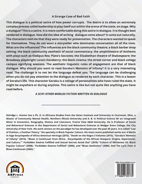 A Strange Case of Bad Faith This dialogue is a political satire of how power corrupts. The desire is to allow an extremely complex process called leadership to play itself out within the arena of the state. Why a dialogue? This is a satire. It is more comfortable doing this satire in dialogue. It is thought best rendered in dialogue. How did the idea of writing dialogue come about? It came out naturally. The characteristics told me that they were ready for presentation. The characters wanted to speak for themselves. They do not want a storyteller who dominates conversation all of the time. What are the influences? The influences are the black community theater; a black barber shop setting; the black community aesthetic of social commentary; the amphitheater of Anthems with plays such as Oedipus Rex; Plato's Socrates; the Elizabethan theater of Shakespeare; the Broadway playwright Lorain Hansberry; the black cinema; the street corner and black college campus signifying sessions. The aesthetic linguistic rules of engagement are that of black dialogue. Why should you want to read Goraka's Memoirs of Infamy? It is a very interesting read. The challenge is to not let the language defeat you. The language can be challenging when you do not pay attention to the dialogue as rendered by each character. This is a lesson of Goraka's life. This character Goraka is a collage of personalities who have ruled the state. It might be anywhere or during anytime. This satire is like but not quite like anything you have read before. A SCIFI OTHER WORLDS FICTION WRITTEN IN DIALOGUE