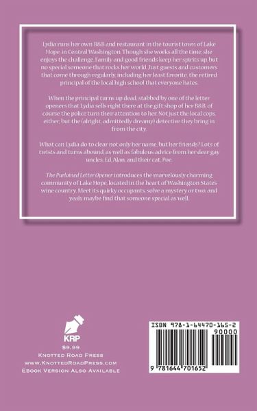 Lydia runs her own B&B and restaurant in the tourist town of Lake Hope, in Central Washington. Though she works all the time, she enjoys the challenge. Family and good friends keep her spirits up, but no special someone that rocks her world. Just guests and customers that come through regularly, including her least favorite, the retired principal of the local high school that everyone hates. When the principal turns up dead, stabbed by one of the letter openers that Lydia sells right there at the gift shop of her B&B, of course the police turn their attention to her. Not just the local cops, either, but the (alright, admittedly dreamy) detective they bring in from the city. What can Lydia do to clear not only her name, but her friends? Lots of twists and turns abound, as well as fabulous advice from her dear gay uncles: Ed, Alan, and their cat, Poe. The Purloined Letter Opener introduces the marvelously charming community of Lake Hope, located in the heart of Washington State's wine country. Meet its quirky occupants, solve a mystery or two, and yeah, maybe find that someone special as well.