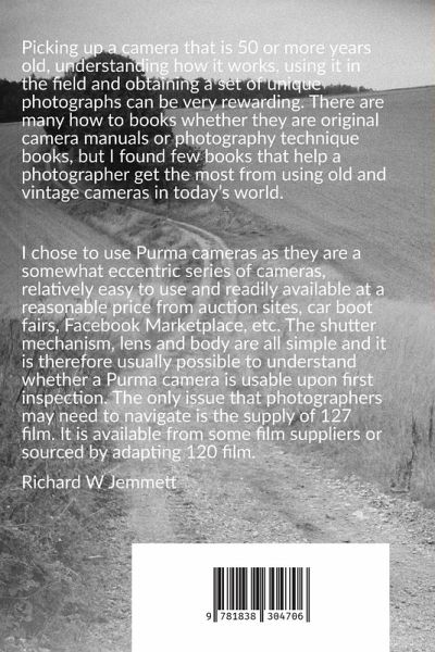 Picking up a camera that is 50 or more years old, understanding how it works, using it in the field and obtaining a set of unique photographs can be very rewarding. There are many how to books whether they are original camera manuals or photography technique books, but I found few books that help a photographer get the most from using old and vintage cameras in today's world. ¿¿I chose to use Purma cameras as they are a somewhat eccentric series of cameras, relatively easy to use and readily available at a reasonable price from auction sites, car boot fairs, Facebook Marketplace, etc. The shutter mechanism, lens and body are all simple and it is therefore usually possible to understand whether a Purma camera is usable upon first inspection. The only issue that photographers may need to navigate is the supply of 127 film. It is available from some film suppliers or sourced by adapting 120 film.