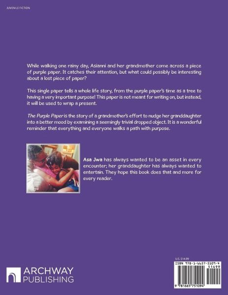 While walking one rainy day, Asianni and her grandmother come across a piece of purple paper. It catches their attention, but what could possibly be interesting about a lost piece of paper? This single paper tells a whole life story, from the purple paper's time as a tree to having a very important purpose! This paper is not meant for writing on, but instead, it will be used to wrap a present. The Purple Paper is the story of a grandmother's effort to nudge her granddaughter into a better mood by examining a seemingly trivial dropped object. It is a wonderful reminder that everything and everyone walks a path with purpose.