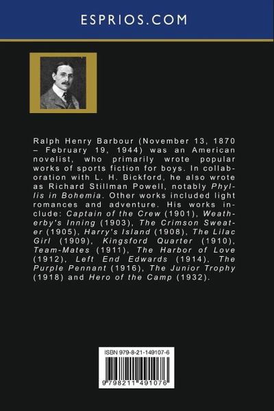 Ralph Henry Barbour (November 13, 1870 - February 19, 1944) was an American novelist, who primarily wrote popular works of sports fiction for boys. In collaboration with L. H. Bickford, he also wrote as Richard Stillman Powell, notably Phyllis in Bohemia. Other works included light romances and adventure. His works include: Captain of the Crew (1901), Weatherby's Inning (1903), The Crimson Sweater (1905), Harry's Island (1908), The Lilac Girl (1909), Kingsford Quarter (1910), Team-Mates (1911), The Harbor of Love (1912), Left End Edwards (1914), The Purple Pennant (1916), The Junior Trophy (1918) and Hero of the Camp (1932).…mehr