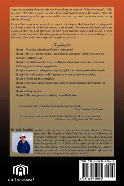 Since the begining of time people have been asking the question "Why do we exist?", "who is God?", "Why does a good God allow for so much pain to exist in the world?", "How do various institutions such as government, education, marriage, work and others fit into the big scheme of things?" From a Christian perspective people are made in the image of God, since God is a being made up of three connected yet distinct entities, so are humans. The three entities that humans are composed of are: the body (physical), the spiritual (mind and conciousness) and the soul (given to us by God at conception). The whole purpose of life is to return to God what God has given us (the soul). How we do this is explored throughout this book.