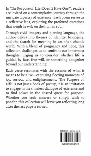 In "The Purpose of Life: Does It Have One?", readers are invited on a contemplative journey through the intricate tapestry of existence. Each poem serves as a reflective lens, exploring the profound questions that weigh heavily on the human soul. Through vivid imagery and piercing language, the author delves into themes of identity, belonging, and the search for meaning in an often chaotic world. With a blend of poignancy and hope, this collection challenges us to confront our innermost thoughts, urging us to consider whether life is guided by fate, free will, or something altogether beyond our understanding. Each verse resonates with the essence of what it means to be alive-capturing fleeting moments of joy, sorrow, and enlightenment. "The Purpose of Life" is not just a book of poetry; it is an invitation to engage in the timeless dialogue of existence and to find solace in the shared quest for purpose. Whether you seek answers or simply wish to ponder, this collection will leave you reflecting long after the last page is turned.