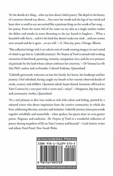 'It's the details of a thing...what eye love about Gabe's poetry. The depth in the beauty of a moment slowed way down... Eye enter her words and the legs of my mind and heart slow to stroll as eye am carried like a precious thing on the words of her song...her poetry. From the warm feel of the water on my skin as a single mother washes the dishes and sneaks in some dreaming to the joy found in laughter... What a beautiful walk this is...and its the kind that doesnt make one tired...and you wanna turn around and do it again...so eye will.' - E. Nina Jay, poet, Chicago, Illinois 'This collection brings with it an eclectic mix of words creating imagery in one's mind of which to get lost in. Gabrielle Journey's The Purpose of Truth is tainted with evoking memories of sisterhood, parenting, maturity, compassion, love, and the ever presence of gratitude for the land whose culture embraces her creativity.' - Dr Vanessa Lee-Ah Mat PhD, author and co-founder, Cultural Embassy, Queensland 'Gabrielle generously welcomes us into her family, her home, her landscape and her journey. I feel refreshed, having caught my breath in her warmly observed details of meals, country and children. Questions asked, hopes shared, humanity affirmed on Yuin Country by a true poet with a warm soul - enjoy!' - Morganics, hip hop artist and community worker, Queensland 'It's a real pleasure to dive into works so rich with colour and feeling, penned by a talented writer who draws inspiration from the creative community in which she lives, celebrating diversity, activism and inclusion. Gabrielle Journey Jones puts words together mindfully and masterfully - when spoken, her pieces share an even greater power. Poignant and authentic, The Purpose of Truth is a wonderful collection of poetry sharing snapshots of life on Yuin Country and beyond.' - Leah Szántó, writer and editor, Final Proof, New South Wales