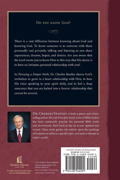 How can I strengthen my faith? Do I really know God? God invites all of us to grow in spiritual intimacy with Him, and it's important for Christians to evaluate the depth of their faith and look for ways to deepen it in their everyday lives. What we believe about God is likely to define the degree to which we become like him in character. And God's Word--the Bible--is the reference to which we must return continually to compare what we believe with what God desires for us. In Pursuing a Deeper Faith, Dr. Charles Stanley uses Scripture as the frame of reference for our understanding of God, Jesus Christ, and faith. You'll learn how to tell if you are growing spiritually and what you can do to increase your intimacy with your Creator. With over 1 million copies sold, the Charles F. Stanley Bible Study Series is a unique approach to Bible study, incorporating biblical truth, personal insights, emotional responses, and a call to action. Each study draws on Dr. Stanley's many years of teaching the guiding principles found in God's Word, showing how we can apply them in practical ways to every situation we face. Each of the ten lessons includes: A brief look at what is covered in the lesson. A teaching from Dr. Stanley that unpacks the topic of the lesson. Application and Bible study questions based on the key points. Key takeaways to put into practice today and tomorrow.