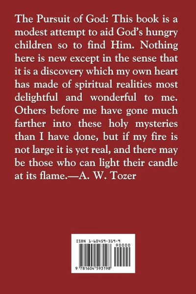 The Pursuit of God: This book is a modest attempt to aid God's hungry children so to find Him. Nothing here is new except in the sense that it is a discovery which my own heart has made of spiritual realities most delightful and wonderful to me. Others before me have gone much farther into these holy mysteries than I have done, but if my fire is not large it is yet real, and there may be those who can light their candle at its flame.-A. W. Tozer