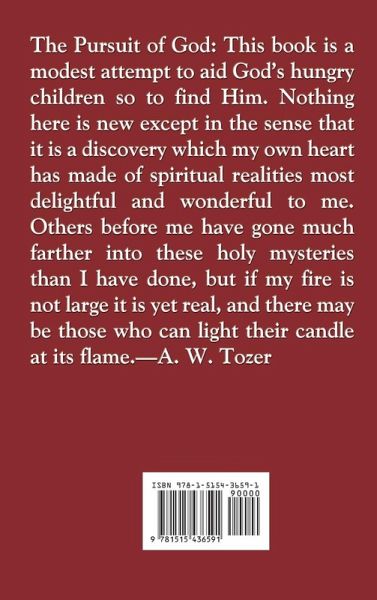 The Pursuit of God: This book is a modest attempt to aid God's hungry children so to find Him. Nothing here is new except in the sense that it is a discovery which my own heart has made of spiritual realities most delightful and wonderful to me. Others before me have gone much farther into these holy mysteries than I have done, but if my fire is not large it is yet real, and there may be those who can light their candle at its flame.-A. W. Tozer