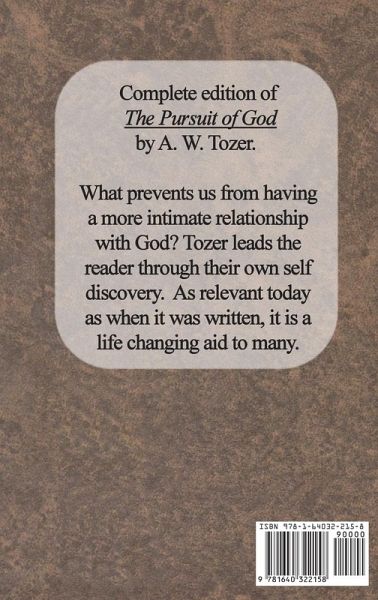 Complete edition of The Pursuit of God by A. W. Tozer. What prevents us from having a more intimate relationship with God? Tozer leads the reader through their own self discovery. As relevant today as when it was written, it is a life changing aid to many. "Self is the opaque veil that hides the Face of God from us. It can be removed only in spiritual experience, never by mere instruction. As well try to instruct leprosy out of our system. There must be a work of God in destruction before we are free. We must invite the cross to do its deadly work within us." No student of thought should be without this historic book. This edition is provided in a slim volume with full text at an affordable price.