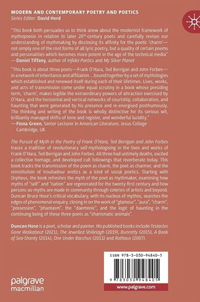 The Pursuit of Myth in the Poetry of Frank O'Hara, Ted Berrigan and John Forbes traces a tradition of revolutionary self-mythologising in the lives and works of Frank O'Hara, Ted Berrigan and John Forbes, as a significant trefoil in twentieth-century English language poetry. All three had untimely deaths, excited a collective homage, and developed cult followings that reverberate today. This book tracks the transmission of the poem as charm, the poet as charmer, and the reinstitution of troubadour erotics as a kind of social poetics. Starting with Orpheus, the book refreshes the myth of the poet as mythmaker, examining how myths of "self" and "nation" are regenerated for the twenty-first century and how persons-as-myths are made in community through coteries of artists and beyond. Duncan Bruce Hose's critical vocabulary, with its nucleus of mythos, searches the edges of phenomenal enquiry, closing in on the work of "glamour", "aura", "charm", "possession", "phantasm", the "daemonic", and the logic of haunting in the continuing being of these three poets as "charismatic animals".