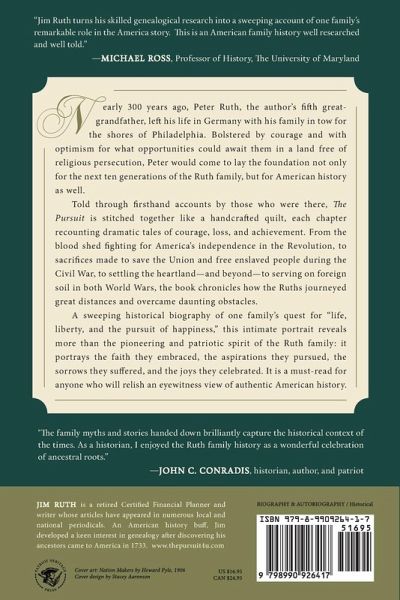 "[Ruth's] writing is . . . skillful and his familial pride is palpable. . . . The personal reflections of Ruth's ancestors, providing distinctive eyewitness testimony to the history they lived, are used to great effect." --Kirkus Reviews "Although the focus is on the Ruth family, general readers will find much to captivate them as the story moves through the centuries . . . in clear prose that is both engaging and illuminating." --IndieReader "With The Pursuit, Jim Ruth turns his skilled genealogical research into a sweeping account of one family's remarkable role in the America story. This is an American family history well researched and well told." --Michael Ross, Professor of History, The University of Maryland Nearly 300 years ago, Peter Ruth, the author's fifth great-grandfather, left his life in Germany with his family in tow for the shores of Philadelphia. Bolstered by courage and with optimism for what opportunities could await them in a land free of religious persecution, Peter would come to lay the foundation not only for the next ten generations of the Ruth family, but for American history as well. After braving a harrowing voyage across the Atlantic Ocean in 1733, the Ruths transformed Pennsylvania forests into farmland and endured attacks during the French and Indian War. Their children and grandchildren shed their blood fighting for America's independence in the Revolution. In the Civil War, the family again made sacrifices to save the Union and free enslaved people. Beyond the battlefield, pioneering Ruths helped settle America's heartland, pushing the country's boundaries farther west toward the Pacific. On a global stage, one ancestor won the Nobel Peace Prize, while other family patriots died fighting on foreign soil in both World Wars. Told through firsthand accounts by those who were there, The Pursuit is stitched together like a handcrafted quilt, each chapter recounting dramatic tales of courage, loss, and achievement. It chronicles how the Ruths journeyed great distances and overcame daunting obstacles. It reveals the faith they embraced, the aspirations they pursued, the sorrows they suffered, and the joys they celebrated. A sweeping historical biography of one family's quest for "life, liberty, and the pursuit of happiness," this intimate portrait is a must-read for anyone who will relish an eyewitness view of authentic American history.