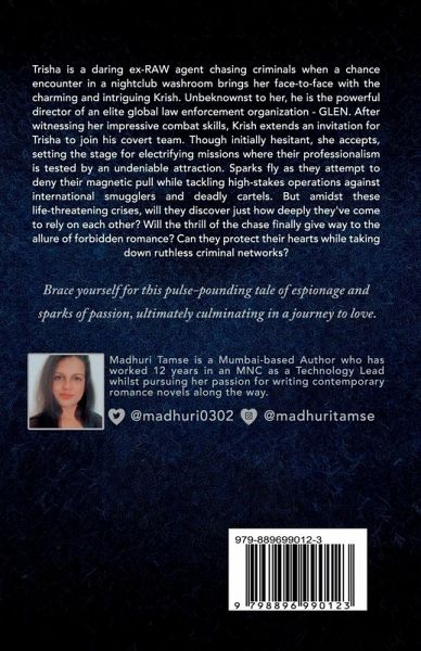 Trisha Chaudhary is a daring ex-RAW agent chasing criminals when a chance encounter in a nightclub washroom brings her face-to-face with the charming and intriguing Krish Rajvanshi. Unbeknownst to her, he is the powerful director of an elite global law enforcement organization - GLEN. After witnessing her impressive combat skills, Krish extends an invitation for Trisha to join his covert team. Though initially hesitant, she accepts, setting the stage for electrifying missions where their professionalism is tested by an undeniable attraction. Sparks fly as they attempt to deny their magnetic pull while tackling high-stakes operations against international smugglers and deadly cartels. But amidst these life-threatening crises, will they discover just how deeply they've come to rely on each other? Will the thrill of the chase finally give way to the allure of forbidden romance? Can they protect their hearts while taking down ruthless criminal networks? A pulse-pounding tale of espionage and sparks of passion, ultimately culminating in a journey to love. Note: Krish and Trisha are side characters of my Political Romance Trilogy (Book 1- The Gamble, Book 2- The Maze, Book 3 - The Checkmate). Although this book can be read as a standalone, it would be more interesting if you read the Political romance Trilogy first.
